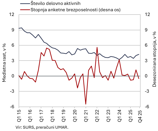 Po anketnih podatkih je bilo število brezposelnih v zadnjem četrtletju lani medletno večje, število delovno aktivnih pa manjše. Anketno brezposelnih je bilo 42 tisoč oseb, kar je 13,5 % več kot v zadnjem četrtletju leta 2024. To lahko med drugim povezujemo z upadom delovno aktivnih v predelovalnih dejavnostih. Medletno višja (za 0,6 o. t.) je bila tudi anketna stopnja brezposelnosti (4,1 %). Število delovno aktivnih je bilo v zadnjem četrtletju lani medletno malenkost manjše (–0,5 %) predvsem zaradi manjšega števila zaposlenih v delovnem razmerju, študentskega dela in pomagajočih družinskih članov pa je bilo več.