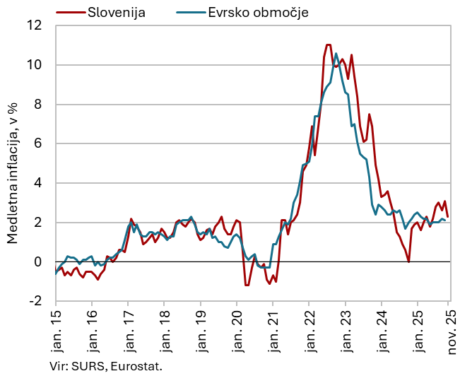 Cene življenjskih potrebščin so novembra drugi mesec zapored ostale nespremenjene, medletna rast pa se je upočasnila na 2,3 % (s 3,1 % oktobra). K najnižji medletni inflaciji po juniju letos je največ prispevala nižja rast cen v skupini hrane in brezalkoholnih pijač, kjer se je medletna rast ob 0,9-odstotni mesečni pocenitvi znižala z oktobrskih 6,8 % na 5,0 % (najmanj po marcu letos). Cene v tej skupini tako ne naraščajo več najhitreje med vsemi 12 skupinami indeksa cen življenjskih potrebščin, a še vedno največ (0,9 o. t.) prispevajo k inflaciji. Višjo medletno rast (5,1 %) so tokrat imele cene v skupini zdravstvo. Cene poltrajnega blaga so ostale medletno nespremenjene, cene trajnega blaga pa so bile po skromni rasti v zadnjih petih mesecih (ko se je rast gibala med 0,1 % in 0,6 %) novembra ponovno medletno nižje (za 0,4 %). Medletna rast cen storitev (2,7 %) se je ohranila na doseženi ravni.