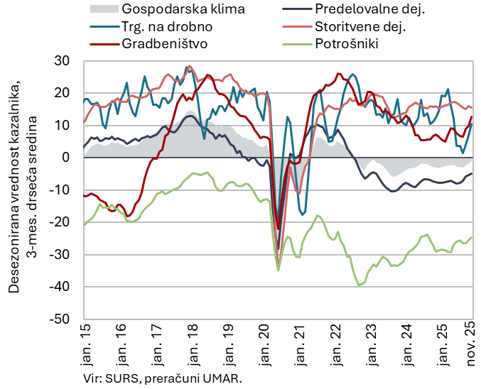 Vrednost kazalnika gospodarske klime se je novembra peti mesec zapored izboljšala, višja je bila tudi medletno. Vrednosti kazalnikov zaupanja potrošnikov in v gradbeništvu sta se tekoče povečali, kazalnik zaupanja v predelovalnih dejavnostih je stagniral, kazalnika v trgovini na drobno in storitvenih dejavnostih pa sta se nekoliko znižala. Enako velja za medletno primerjavo. Vrednost kazalnika gospodarske klime je presegla dolgoletno povprečje drugi mesec zapored (po skoraj treh letih), med dejavnostmi pa to povprečje presegata le vrednosti kazalnikov zaupanja v gradbeništvu in v storitvenih dejavnostih.