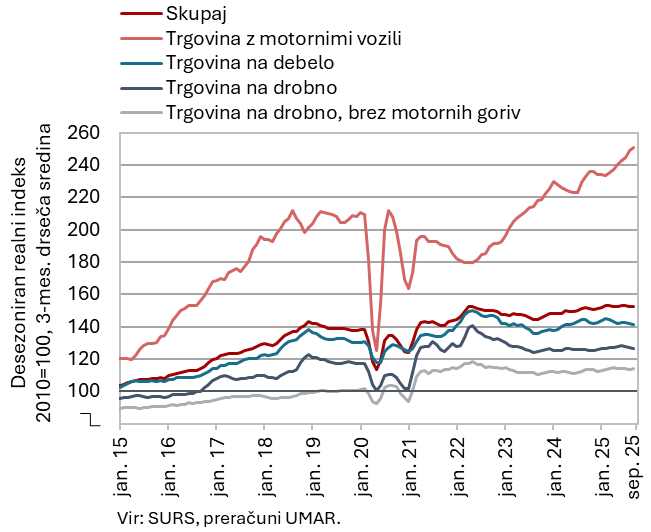 Prihodek v večini trgovinskih panog se je v tretjem četrtletju glede na drugega zmanjšal (desez.). V trgovini na debelo je upadel drugo četrtletje zapored in bil prvič po začetku leta 2024 manjši tudi medletno. Medletno manjši je bil tudi prihodek v trgovini na drobno z živili, ki se je po šibki rasti v drugem četrtletju v tretjem zmanjšal. Prihodek v trgovini na drobno z neživili je ostal podoben kot v drugem četrtletju (ko se je povečal) in bil medletno večji. V trgovini z motornimi vozili pa se je nadaljevala razmeroma visoka rast prihodka. Prodaja v vseh trgovinskih panogah je bila v devetih mesecih medletno večja. V trgovini z motornimi vozili je bila rast visoka (7 %), v ostalih trgovinskih panogah pa skromna (v povprečju 1 %).