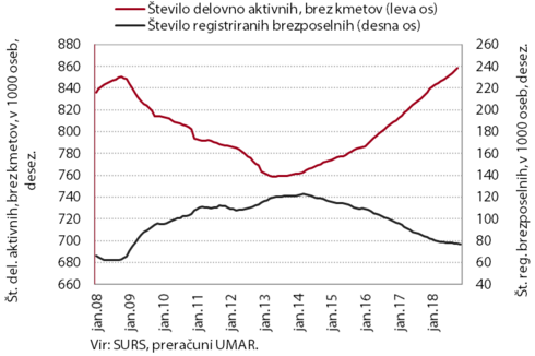 Število delovno aktivnih se povečuje skromneje kot lani, ob pomanjkanju ustrezne delovne sile pa se povečuje zaposlovanje tujcev. Ob nižji rasti zaposlovanja iz brezposelnosti se je umirilo tudi zmanjševanje števila registriranih brezposelnih.