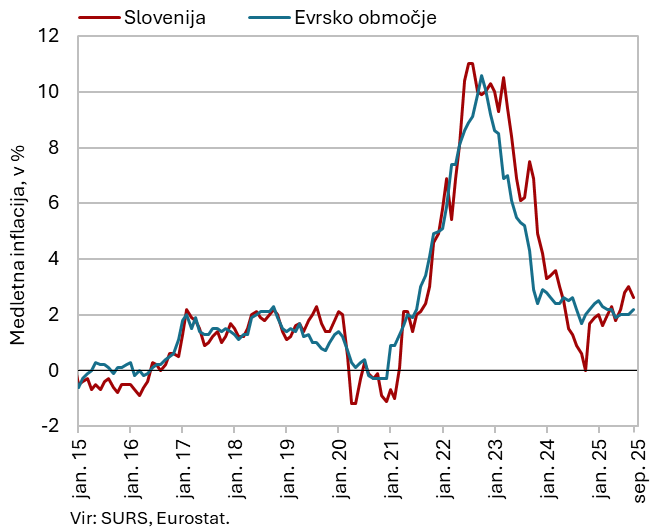 Medletna inflacija se je septembra nekoliko zmanjšala (2,6 %), predvsem zaradi nižje rasti cen obleke in obutve. K inflaciji pa so še naprej največ prispevale višje cene hrane in brezalkoholnih pijač (7 %). Blagovni izvoz in uvoz (brez poslov oplemenitenja) sta se po julijski realni rasti avgusta tekoče zmanjšala in bila manjša tudi medletno, v povprečju prvih osmih mesecev je bil izvoz medletno manjši, uvoz pa na ravni enakega obdobja lani. Prihodek v trgovini je kljub julijskemu poslabšanju poslovanja v večini panog v sedmih mesecih povsod ostal medletno večji. Skupni realni prihodek tržnih storitev se je po upadu v drugem četrtletju julija še zmanjšal in bil približno na ravni lanskega julija. V prvih sedmih mesecih je bil medletno večji le v prometu in skladiščenju ter strokovno-tehničnih dejavnostih. Število registriranih brezposelnih oseb se je po desezoniranih podatkih septembra tretji mesec zapored povečalo (za 0,5 %), predvsem zaradi povečanega priliva državljanov s statusom začasne zaščite v evidenco brezposelnih oseb. Brezposelnih je bilo nekoliko več tudi medletno (za 0,2 %). Donosnost do dospetja obveznic jedrnih držav evrskega območja se je v tretjem četrtletju ob negotovih gospodarskih razmerah ter predvidenem povečevanju javnofinančnih izdatkov za infrastrukturo in obrambo povečala, donosnost do dospetja slovenske obveznice pa se je znižala.