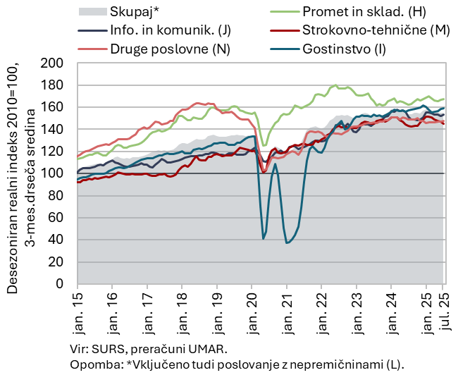 Skupni realni prihodek tržnih storitev se je po upadu v drugem četrtletju julija še zmanjšal (1 %, desez.), medletno je stagniral. Prihodek se je najbolj zmanjšal v strokovno-tehničnih dejavnostih (po močnem nihaju navzdol v drugem četrtletju), predvsem zaradi večjega krčenja v arhitekturno-projektantskih ter svetovalnih storitvah. Zmanjšal se je tudi v gostinstvu, pred tem se je v drugem četrtletju povečal. Prihodek v dejavnosti prometa in skladiščenja se je po upadu v drugem četrtletju nekoliko zmanjšal tudi julija, tokrat najbolj v skladiščenju. Prihodek se je zmanjšal tudi v drugih poslovnih dejavnostih (po rasti v drugem četrtletju). Okrepil se je le v informacijsko-komunikacijskih dejavnostih (po rasti v prvi polovici leta), višja rast je izhajala iz večje prodaje storitev na domačem (računalniške) in tujih trgih (telekomunikacijske). V prvih sedmih mesecih leta je bil realni prihodek medletno večji le v prometu in skladiščenju ter strokovno-tehničnih dejavnostih.