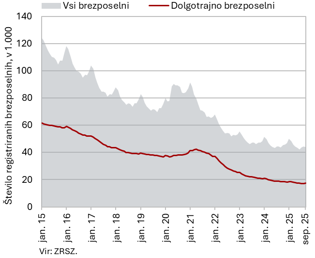Število registriranih brezposelnih oseb se je septembra tretji mesec zapored povečalo (za 0,5 % desez.). Po oceni Zavoda RS za zaposlovanje je to lahko odraz povečanega priliva iskalcev prve zaposlitve v brezposelnost, ki je od julija letos lahko posledica večjega priliva tujih državljanov s statusom začasne zaščite v evidenco brezposelnih oseb zaradi spremenjene zakonodaje. Po originalnih podatkih je bilo konec septembra brezposelnih 43.944 oseb oz. 0,8 % manj kot konec avgusta. Medletno pa jih je bilo za 0,2 % več. Medletni upad dolgotrajno brezposelnih (–6,3 %) in upad brezposelnih, starejših od 50 let (–7,3 %), sta bila nekoliko nižja kot prejšnje mesece. Število brezposelnih mladih (15–29 let) od konca lanskega leta presega ravni izpred leta (septembra jih je bilo medletno 8 % več).