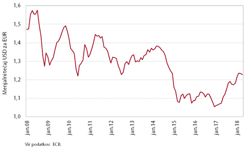 Vrednost evra v primerjavi z ameriškim dolarjem se je aprila nekoliko znižala (-0,5 %). Medletno je bila višja za 14,5 %.
