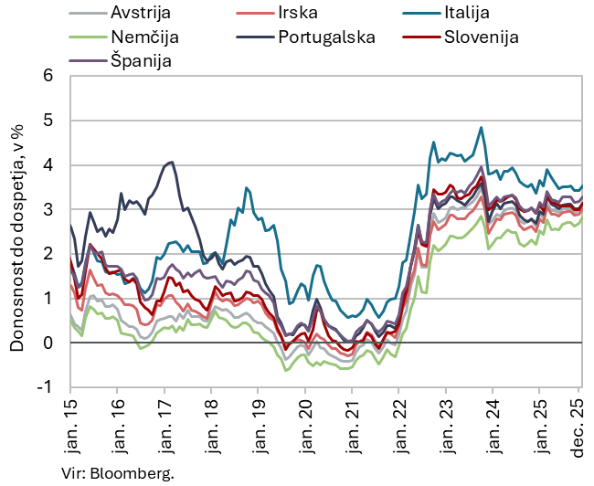 Število brezposelnih je decembra ostalo na ravni prejšnjega meseca (desez.), malenkost pa je preseglo zelo nizko raven iz decembra 2024. Število dolgotrajno brezposelnih in brezposelnih starejših je bilo še naprej manjše kot leto prej, število brezposelnih mladih pa za skoraj desetino večje. Proizvodnja predelovalnih dejavnosti se je novembra tekoče nekoliko okrepila. V enajstih mesecih je ostala medletno manjša; med večjimi dejavnostmi je bil medletni upad največji v proizvodnji vozil in plovil ter kovinski industriji. Donosnost do dospetja slovenske obveznice se je v zadnjem lanskem četrtletju znižala, prav tako razmik do nemške obveznice (na 33 b. t.), ki je bil na najnižji ravni po letu 2007.