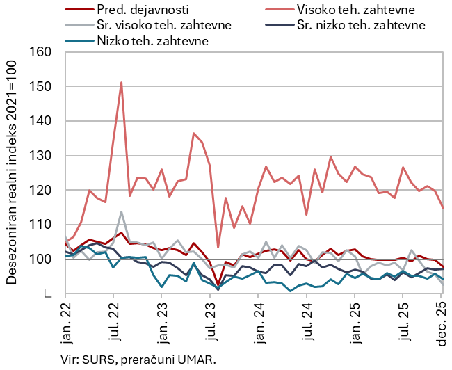 Po skromni okrepitvi v tretjem četrtletju se je proizvodnja predelovalnih dejavnosti v zadnjem lanskem četrtletju znova zmanjšala (desez.) in bila tudi medletno precej manjša (za 2,9 % del. dnem prilagojeno). Proizvodnja se je skrčila v večini skupin po tehnološki zahtevnosti, rast so ohranile le srednje nizko tehnološko zahtevne panoge (desez.), ki so ob koncu leta dosegle ravni izpred leta. V celem letu 2025 pa je bila proizvodnja te skupine panog za 1,8 % manjša kot leta 2024, predvsem zaradi močnega upada v proizvodnji kovinskih izdelkov. Tudi proizvodnja večine srednje visoko in visoko tehnološko zahtevnih panog je zaostala za letom 2024, najbolj (za desetino) proizvodnja motornih vozil (skupaj s kovinsko industrijo sta k lanskemu 1,5-odstotnemu upadu proizvodnje predelovalnih dejavnosti prispevali največ). Med tehnološko zahtevnejšimi panogami je bila večja le proizvodnja opreme IKT, energetsko intenzivna kemična industrija pa je dosegla podobno raven kot leta 2024. Proizvodnja nizko tehnološko zahtevnih panog pa se je lani povečala (za 2,0 %), a so k temu prispevale le živilska in lesna industrija ter druge raznovrstne predelovalne dejavnosti.