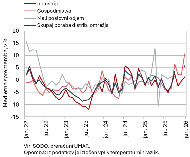 Poraba elektrike na distribucijskem omrežju je bila januarja medletno višja za 5,6 %. Industrijska poraba je bila ob enem delovnem dnevu manj medletno višja za 1,2 %, pri čemer je bil dejanski koledarski učinek zaradi razporeditve praznikov verjetno omejen. Poraba malih poslovnih odjemalcev se je medletno povečala za 5,3 %. Medletna rast porabe elektrike v gospodinjstvih je tudi po izločitvi vremenskega vpliva ostala visoka (10,6 %). To lahko nakazuje širše spremembe v načinu ogrevanja gospodinjstev, zlasti večjo uporabo električnih naprav (npr. toplotnih črpalk).