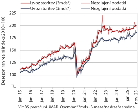 Slovenski izvoz blaga je bil v enajstih mesecih leta 2025 nekoliko manjši kot leto prej, aktivnost v gradbeništvu in potrošnja gospodinjstev pa sta se v desetih mesecih povečali. Realni izvoz blaga se je novembra tekoče povečal drugi mesec zapored, uvoz pa zmanjšal. V enajstih mesecih leta 2025 je bil izvoz blaga za 0,2 % manjši kot v enakem obdobju leto prej, uvoz pa večji za 1,6 %. Na upad izvoza je vplival predvsem manjši izvoz vozil ter drugih strojev in naprav, pa tudi železa in jekla ter nekaterih drugih materialov (izdelki iz kavčuka, mineralni proizvodi, papir). Proizvodnja predelovalnih dejavnosti se je novembra tekoče nekoliko okrepila. V enajstih mesecih je ostala medletno manjša; med večjimi dejavnostmi je bil medletni upad največji v proizvodnji vozil in plovil ter kovinski industriji. Rast vrednosti opravljenih gradbenih del se je po upadu v prvem četrtletju lani od drugega četrtletja močno okrepila, v desetih mesecih je bila medletno večja za desetino. Realni prihodek v večini trgovinskih panog se je po zmanjšanju v tretjem četrtletju oktobra povečal, prodaja v vseh trgovinskih panogah je bila v desetih mesecih lani medletno večja. Realni prihodek tržnih storitev se je po močni rasti v tretjem četrtletju oktobra močno zmanjšal, v desetih mesecih pa je bil medletno manjši le v drugih poslovnih dejavnostih.