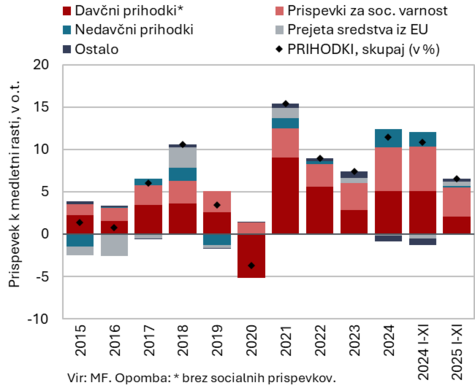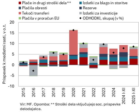 Primanjkljaj konsolidirane bilance javnega financiranja je v enajstih mesecih leta 2025 znašal 1,1 mrd EUR, kar je 560 mio EUR več kot v enakem obdobju predhodnega leta, pri čemer je bilo povečanje načrtovano. V enajstih mesecih lani so se prihodki zvišali za 6,5 %, kar je znatno manj kot v enakem obdobju predhodnega leta (10,8 %). Upočasnitev je povezana s konjunkturnimi dejavniki in ukrepi, ki so vplivali na visoko rast socialnih prispevkov ter določenih davčnih prihodkov v letu 2024. Odhodki so bili v enajstih mesecih lani medletno višji za 8,6 %, kar je nekoliko višja rast kot v enakem obdobju predhodnega leta (7,8 %). K rasti odhodkov so lani največ prispevali sredstva za plače zaposlenim zaradi izvajanja plačne reforme, pokojnine in nekateri drugi transferji. Po znižanju v letu 2024 so se v letu 2025 povečevali tudi investicijski odhodki, zlasti za nakup vojaške opreme. Pretežni del primanjkljaja konsolidirane bilance je izhajal iz primanjkljaja državnega proračuna. Ta je v enajstih mesecih leta 2025 znašal 976 mio EUR. Po pričakovanjih pa se je decembra precej povečal in v letu 2025 znašal 1.717 mio EUR oz. 2,4 % BDP, kar je nekoliko manj od predvidenega s spremembami državnega proračuna za leto 2025 (1.866 mio EUR oz. 2,6 % BDP). Na povečanje primanjkljaja ob koncu leta so najbolj vplivala izplačila zimskega regresa javnim uslužbencem, zimskega dodatka za upokojence, sredstev za pokrivanje obveznosti javnih zdravstvenih zavodov ter krepitev investicijske porabe.