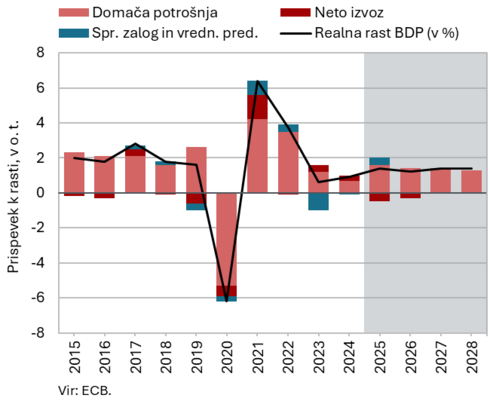 ECB v decembrski napovedi za letos pričakuje nekoliko manjšo rast BDP evrskega območja kot v preteklem letu. Gospodarstvo evrskega območja je lani kljub zahtevnemu mednarodnemu okolju zraslo bolj od pričakovanj mednarodnih institucij, k čemur je prispevala predvsem pospešitev trgovinske menjave pred uvedbo višjih carin. Letos bo glavno gonilo rasti ostala zasebna potrošnja ob višjih realnih plačah, visoki zaposlenosti in postopnem zniževanju stopnje varčevanja. Gospodarstvo bodo podpirale tudi podjetniške naložbe ter višji izdatki za infrastrukturo in obrambo (zlasti v Nemčiji). Realna rast BDP naj bi letos znašala 1,2 % (v letu 2025 1,4 %), v letih 2027 in 2028 pa 1,4 %. Tveganja za uresničitev napovedi ostajajo velika. Kljub umirjanju trgovinskih napetosti ostaja mednarodno okolje negotovo, kar lahko negativno vpliva na dobavne verige, izvoz, potrošnjo in naložbe. ECB je kot pomembni tveganji izpostavila tudi poslabšanje razmer na globalnih finančnih trgih in geopolitične napetosti. Bolj od pričakovanj pa bi gospodarsko rast lahko spodbudili obrambni in infrastrukturni izdatki ter reforme za krepitev produktivnosti.