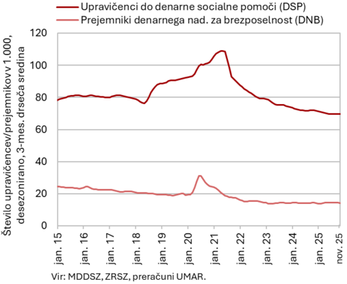 Prejemnikov denarnega nadomestila za brezposelnost (DNB) in upravičencev do denarne socialne pomoči (DSP) je bilo tudi novembra manj kot pred letom. Prejemnikov DNB je bilo 13.493, kar je 3,7 % manj kot novembra leto prej. Njihov delež med vsemi brezposelnimi je bil novembra (29,5 %) nekoliko manjši kot pred letom (30,6 %). Ob zmanjševanju števila dolgotrajno brezposelnih oseb, ki so pogosto upravičene do DSP, se je nadaljevalo medletno zmanjševanje števila upravičencev do DSP. Novembra je bilo do DSP upravičenih 68.493 oseb, kar je 2,5 % manj kot pred letom; upad je bil manjši kot v zadnjih mesecih. V povprečju je bilo za DSP lani mesečno izplačanih okoli 20 mio EUR.