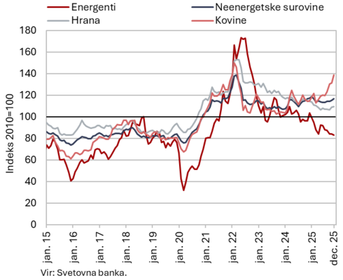 Cena nafte Brent se je decembra v primerjavi z novembrom v povprečju znižala, povprečna cena neenergetskih surovin pa nekoliko zvišala. Povprečna dolarska cena nafte Brent se je nadalje znižala za 1,9 % na 62,60 USD, evrska pa za 3,2 % na 53,45 EUR. Medletno je bila cena nafte v dolarjih nižja za 15,3 %, v evrih pa za 24,2 %. V povprečju leta 2025 je bila cena nafte v dolarjih za 14,2 %, v evrih pa za 17,4 % nižja kot leto prej. Povprečna evrska cena zemeljskega plina na evropskem trgu (na nizozemski borzi TTF) se je ob povečanem dotoku utekočinjenega zemeljskega plina iz ZDA in stabilni norveški dobavi decembra še znižala, in sicer za 10,5 % na 27,62 EUR/MWh, ter bila najnižja v skoraj dveh letih. Medletno je bila nižja za 38,8 %. V povprečju leta 2025 je bila za 5,3 % višja kot leto prej. Po podatkih Svetovne banke se je povprečna dolarska cena neenergetskih surovin decembra mesečno nekoliko zvišala, medletno je stagnirala. Mesečno so se najbolj zvišale cene kovin in mineralov (za 5,3 %), ki so bile precej višje tudi medletno (19,2 %). V letu 2025 so bile dolarske cene neenergetskih surovin za 2,4 % višje kot leto prej.