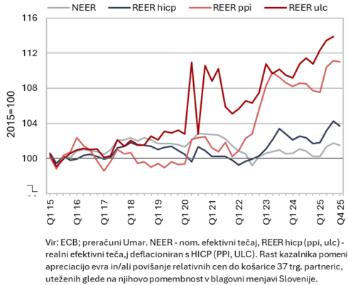 Poslabšanje kazalnikov cenovne konkurenčnosti, ki se je sredi leta 2025 pridružilo slabšanju stroškovne konkurenčnosti, se je ob koncu leta ustavilo. Stroškovna konkurenčnost (REER ulc) se je postopno poslabševala že večji del leta 2024, predvsem zaradi močne rasti (nominalnih) stroškov dela na enoto proizvoda (NULC) v gradbeništvu. V prvih treh četrtletjih 2025 je bila njihova rast med dejavnostmi poslovnega sektorja prisotna predvsem v predelovalnih dejavnostih in tržnih storitvah. V primerjavi z EU je izstopala predvsem višja rast v predelovalnih dejavnostih, ki pa je bila nižja kot v skupini višegrajskih držav. Kazalnika cenovne konkurenčnosti (REER ppi, hicp), ki sta se po energetski krizi postopno izboljševala, sta se v drugem in tretjem četrtletju 2025 poslabšala, v zadnjem četrtletju pa se je njuna rast ustavila. Na to je poleg depreciacije evra (zmanjšanje NEER) vplivala tudi nižja rast cen življenjskih potrebščin (HICP) v Sloveniji v primerjavi s trgovinskimi partnericami (rast PPI pa je bila podobna).