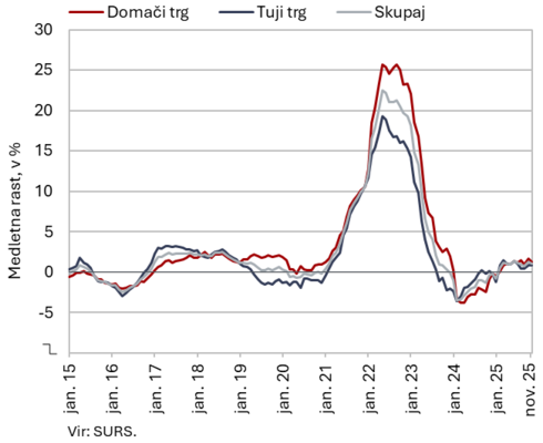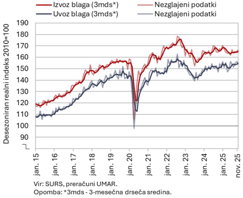 Realni izvoz blaga se je novembra tekoče povečal, uvoz pa zmanjšal; oba sta bila v povprečju zadnjih dveh mesecev višja kot v tretjem četrtletju (desez.). Realni izvoz blaga se je tekoče povečal drugi mesec zapored, najbolj izvoz vozil in opreme, ki sicer precej niha. Večji je bil tudi izvoz drugih strojev in naprav ter kemičnih izdelkov, zlasti farmacevtskih. Zmanjšal se je izvoz primarnih izdelkov, predvsem hrane, in nekaterih materialov. Realni uvoz blaga se je po več mesecih rasti novembra zmanjšal. K upadu je prispeval predvsem manjši uvoz proizvodov za vmesno potrošnjo, ki sicer že več mesecev opazno niha (desez.). V enajstih mesecih leta 2025 je bil izvoz medletno manjši za 0,2 %, uvoz pa večji za 1,6 %. Na medletni upad izvoza je vplival predvsem manjši izvoz vozil ter drugih strojev in naprav, manjši je bil tudi izvoz železa in jekla ter nekaterih drugih materialov (izdelki iz kavčuka, mineralni proizvodi, papir). Povečal se je izvoz večine drugih glavnih skupin proizvodov, najbolj farmacevtskih. Izvozna naročila v predelovalnih dejavnostih so tudi decembra ostala nespremenjena na zelo nizki ravni.