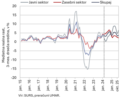 Medletna nominalna rast povprečne bruto plače je bila oktobra (7,7 %) višja kot v predhodnih mesecih, kar je predvsem posledica okrepljene rasti v javnem sektorju. V slednjem je bila oktobra nominalna plača medletno višja za 12,1 %. Okrepitev v primerjavi s predhodnimi meseci je posledica izplačila drugega obroka dogovorjenega zvišanja osnovnih plač. Tudi v zasebnem sektorju ostaja rast, ob precejšnjem pomanjkanju delovne sile, razmeroma visoka (5,2 %).