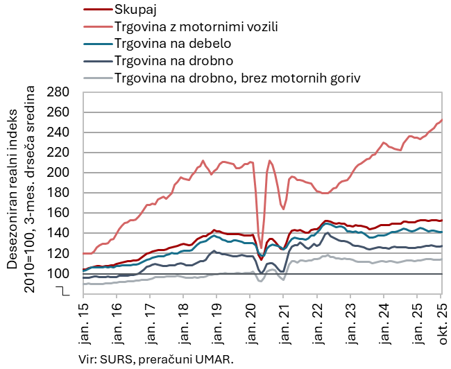 Po 1-odstotni realni rasti v tretjem četrtletju razpoložljivi podatki nakazujejo medletno večjo potrošnjo gospodinjstev tudi v četrtem četrtletju 2025. Število prodanih novih osebnih avtomobilov v uporabi fizičnih oseb je bilo oktobra medletno večje za 6 %. Gospodinjstva so medletno več trošila tudi za živila, pijače, tobačne izdelke in neživila (skupni prihodek v trgovini na drobno z živili in neživili je bil realno večji za 3 %). Večje kot pred letom je bilo tudi število domačih prenočitev v Sloveniji in na Hrvaškem ter skupno trošenje za turistične storitve v tujini.
