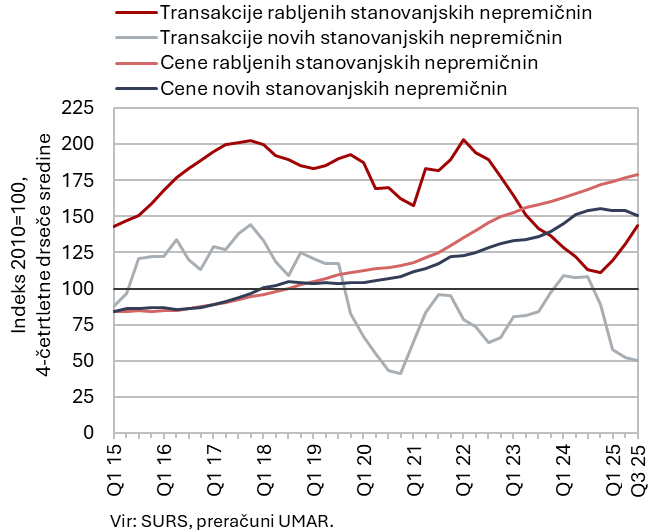 Medletna rast cen stanovanjskih nepremičnin se je v tretjem četrtletju 2025 prepolovila na 2,7 %. Na to je vplival medletni upad cen novih stanovanjskih nepremičnin (–9,5 %), medletna rast cen rabljenih pa je ostala podobna kot v prvih dveh četrtletjih (5,2 %). Število transakcij z rabljenimi stanovanjskimi nepremičninami je bilo po znatnem upadu v obdobju 2022–2024 medletno višje za več kot polovico. Medletno manjša pa je bila prodaja novih stanovanjskih nepremičnin (za 12,4 %), ki so sicer obsegale le manjši del vse prodaje (5 %). Njihove cene so se po izraziti rasti v predhodnem četrtletju v tretjem znatno znižale in bile podobne kot pred dvema letoma.