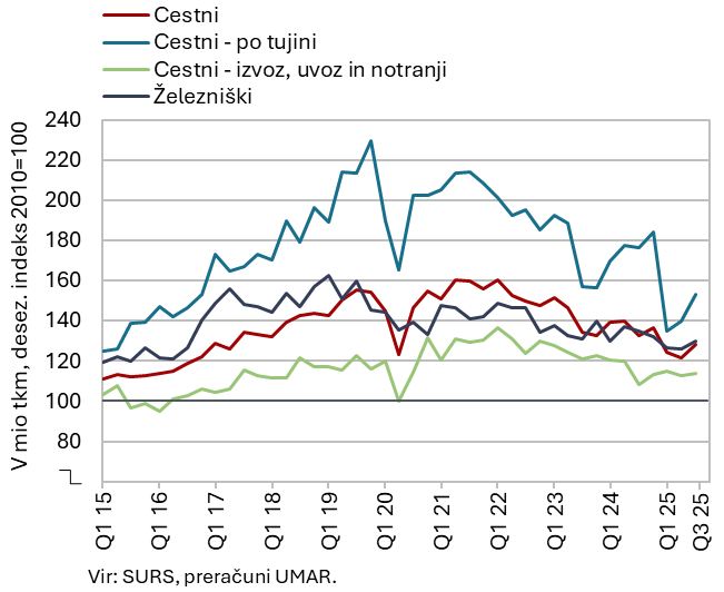 Obseg cestnega in železniškega blagovnega prometa se je po zmanjševanju od leta 2022 v tretjem četrtletju 2025 nekoliko povečal. Skupaj se je obseg cestnih prevozov tekoče povečal za 5 % (desez.), medletno pa se je še zmanjšal (za 3 %). Pri cestnih prevozih slovenskih prevoznikov se je obseg prevozov po tujini drugo četrtletje zapored precej povečal (po močnem upadu v prvem četrtletju), obseg prevozov, ki vsaj deloma potekajo po ozemlju Slovenije (izvoz, uvoz in notranji promet), pa le skromno. Delež prevozov po tujini v skupnih prevozih je znašal 43 % in bil za 5 o. t. manjši kot pred epidemijo. Železniški prevozi blaga po ozemlju Slovenije so se v tretjem četrtletju povečali za 3 % (desez.), medletno pa so bili nižji za 4 %. Obseg cestnih in železniških prevozov blaga je bil leta 2025 najnižji po letu 2016.