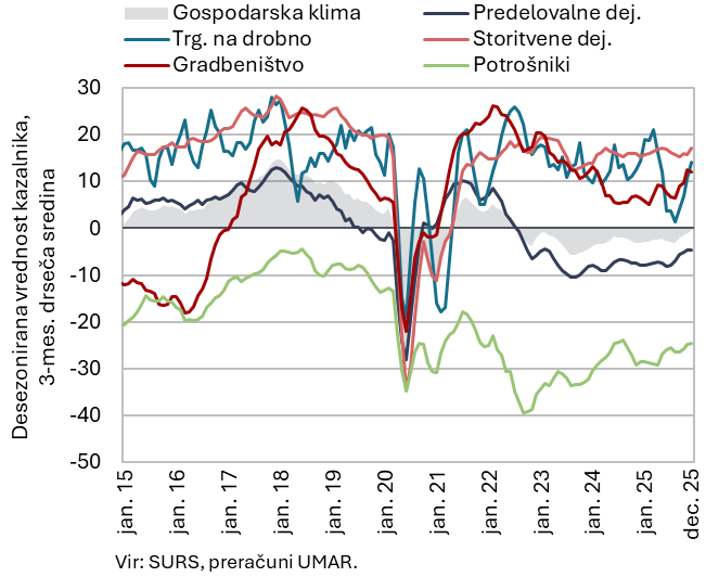 Vrednost kazalnika gospodarske klime se je decembra izboljšala šestič zapored in bila višja tudi medletno. Tekoče so se povečale vrednosti kazalnikov zaupanja v storitvenih dejavnostih, trgovini na drobno in predelovalnih dejavnostih. Poslabšali sta se vrednosti kazalnikov zaupanja med potrošniki in v gradbeništvu, kjer sta na znižanje vplivala kazalnika za skupna naročila ter pričakovano zaposlovanje. V medletni primerjavi so bili opazno višji vsi kazalniki zaupanja, razen v trgovini na drobno, kjer je stagniral. Vrednost kazalnika gospodarske klime četrti mesec vztraja nad dolgoletnim povprečjem. Med dejavnostmi dolgoletno povprečje presegajo vrednosti kazalnikov zaupanja v gradbeništvu, storitvenih dejavnostih in trgovini na drobno.