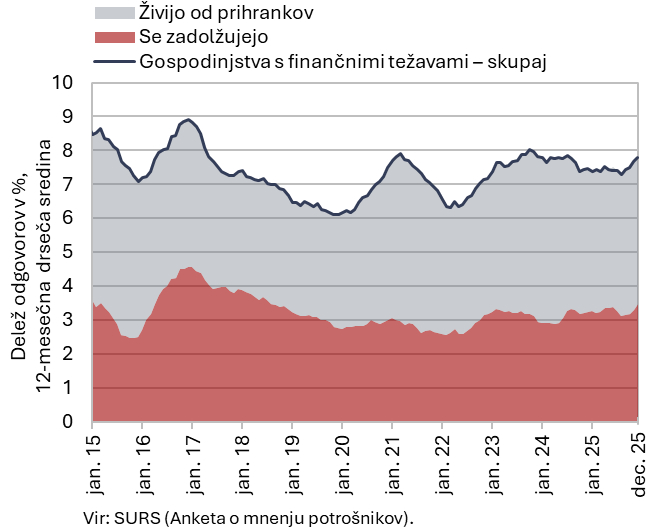 Položaj gospodinjstev s finančnimi težavami se je v zadnjem četrtletju 2025 tekoče in medletno poslabšal, nekoliko boljši je bil le pri gospodinjstvih iz najnižjega dohodkovnega kvartila. V primerjavi s predhodnim četrtletjem se je delež gospodinjstev s finančnimi težavami iz prvega dohodkovnega kvartilnega razreda zmanjšal za 0,3 o. t., medletno pa za 0,7 o. t., na 13,2 %. Poslabšal se je finančni položaj gospodinjstev iz drugega in tretjega dohodkovnega kvartilnega razreda, kjer se je delež tistih s finančnimi težavami medletno povečal za 2,6 o. t., na 10,5 % oziroma 8,0 %. Med gospodinjstvi s finančnimi težavami je bil delež tistih, ki so se zadolževala, medletno nekoliko večji, delež tistih, ki so svoje finančne potrebe premoščala s porabo prihrankov, pa je ostal podoben.
