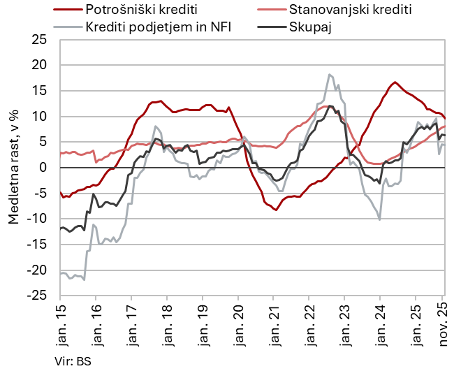 Medletna rast obsega kreditov domačim nebančnim sektorjem je novembra ostala na ravni predhodnega meseca (6,3 %). Rast kreditov podjetjem in NFI (4,5 %) ter gospodinjstvom (7,6 %) se ni opazneje spremenila. Pri gospodinjstvih se še naprej krepi rast stanovanjskih posojil (8,1 %), ki obsegajo skoraj dve tretjini vseh posojil gospodinjstvom. Obseg novega kreditiranja v obliki stanovanjskih posojil se je v enajstih mesecih lani v primerjavi z enakim obdobjem leto prej povečal za polovico. Rast potrošniških posojil pa se je še naprej postopoma umirjala in je bila z 9,6 % najnižja po oktobru 2023. Ohranja se tudi medletna rast vlog nebančnih sektorjev (6,3 %), ki jo poganja predvsem rast vlog čez noč (8,6 %). Te zajemajo več kot 80 % vseh vlog nebančnih sektorjev. Vloge podjetij in NFI (7 %) naraščajo nekoliko hitreje kot vloge gospodinjstev (5,9 %). Kakovost terjatev bančnega sistema je dobra. Delež nedonosnih terjatev se je oktobra ohranil pri 1,2 %.