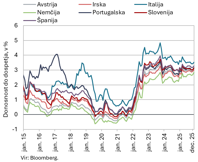 Donosnost do dospetja slovenske obveznice se je v zadnjem lanskem četrtletju znižala za 4 b. t., na 3,05 %. Razmik do nemške obveznice se je znižal za 6 b. t., na 33 b. t., kar je najnižja raven po letu 2007. ECB ob odsotnosti inflacijskih pritiskov v zadnjem lanskem četrtletju osrednje obrestne mere ni spreminjala.