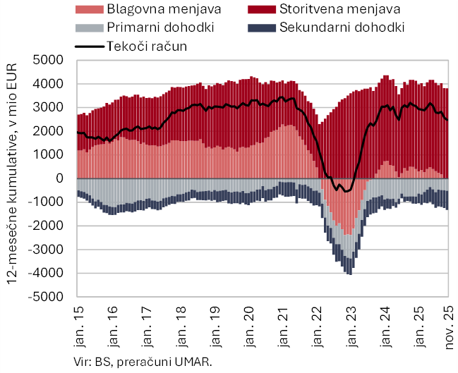 Presežek tekočega računa plačilne bilance je v enajstih mesecih leta 2025 znašal 2,4 mrd EUR in je bil za 0,6 mrd EUR nižji kot v enakem predhodnem obdobju. K znižanju je največ prispeval večji primanjkljaj sekundarnih dohodkov, predvsem zaradi manj prejetih sredstev iz proračuna EU. K znižanju presežka je ob hitrejši rasti uvoza od izvoza blaga prispeval tudi blagovni saldo. Storitveni presežek se je povečal, najbolj v menjavi potovanj (rast turističnih prihodkov od obiska tujih turistov je presegala rast izdatkov domačega prebivalstva za potovanja v tujino). Precej se je povečal tudi presežek v menjavi zavarovalniških storitev, saj je slovenska zavarovalnica na italijanskem trgu avtomobilskih zavarovanj povečala obseg poslovanja in s tem povezanih storitev. Primanjkljaj primarnih dohodkov je bil nižji predvsem zaradi manjših neto odlivov dohodkov od lastniškega kapitala (dividend in dobička) ter višjih prihodkov slovenskih delavcev od dela v tujini.