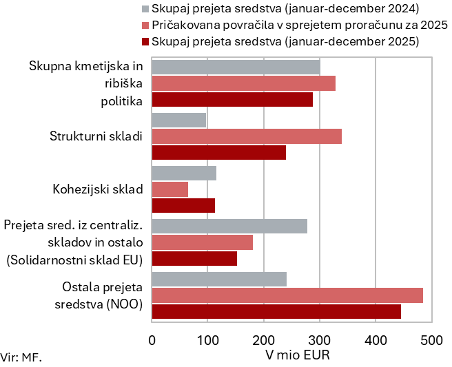 Slovenija je v letu 2025 prejela več sredstev iz virov EU kot leta 2024, povečal se je tudi pozitiven neto položaj. Slovenija je lani iz proračuna EU prejela 1.239,1 mio EUR oz. 207 mio EUR več kot leto prej. V proračun EU je vplačala 719,8 mio EUR (635,8 mio EUR leto prej). Neto pozitiven proračunski položaj se je tako povečal na 519,3 mio EUR. Povečani lanski prihodki so povezani z izvajanjem Načrta za okrevanje in odpornost (444,8 mio EUR), kjer je bila realizacija visoka tudi glede na načrtovano v državnem proračunu (91,8-odstotna), in projektov strukturnih skladov (240,4 mio EUR), kjer pa je za načrtovano bolj zaostajala (70,8-odstotna realizacija). Prejeta sredstva iz Kohezijskega sklada (113,5 mio EUR) so bila na podobni ravni kot leto prej in so presegla načrtovane prilive (174,6 % realizacija). Slovenija je decembra 2025 oddala peti zahtevek za plačilo iz mehanizma za okrevanje in odpornost, z najvišjim možnim neto plačilom v višini okoli 230,7 mio EUR. Do konca leta 2025 je v povezavi z izvajanjem Načrta za okrevanje in odpornost prejela 1,54 mrd EUR oz. 72 % vseh sredstev.