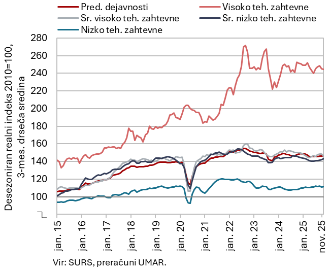 Proizvodnja predelovalnih dejavnosti se je novembra tekoče nekoliko okrepila, v enajstih mesecih pa je ostala medletno manjša. Po skrčenju v začetku leta 2025 se je gibala okoli podobnih ravni. V povprečju oktobra in novembra je bila na ravni tretjega četrtletja, nekoliko višja je bila le proizvodnja srednje nizko tehnološko zahtevnih panog (zaradi skromnega avgusta). V preostalih treh skupinah panog se je po rasti v tretjem četrtletju nekoliko zmanjšala (vse desez.). V enajstih mesecih je bila skupna proizvodnja medletno manjša za 1,1 % (del. dnem prilagojeno), večja je bila le proizvodnja nizko tehnološko zahtevnih panog (2,5 %, del. dnem prilagojeno). Ravni iz enakega obdobja leta 2024 so najbolj presegle druge raznovrstne predelovalne dejavnosti, proizvodnja živil in lesna industrija. Proizvodnja v usnjarstvu je bila četrtino manjša. V ostalih skupinah panog po tehnološki zahtevnosti je bila proizvodnja v večini panog po enajstih mesecih medletno manjša (z izjemo proizvodnje opreme IKT ter popravil in montaže strojev in naprav). Najbolj se je zmanjšala proizvodnja vozil in plovil (za okoli 9 %), v kovinski industriji je bila manjša za okoli 5 %.