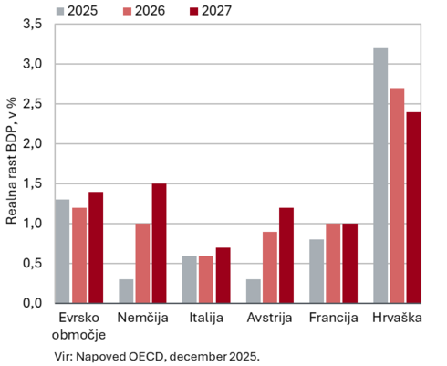 OECD v decembrski napovedi pričakuje umiritev rasti svetovnega BDP v prihodnjem letu. Rast naj bi se z letošnjih 3,2 % znižala na 2,9 %, nato pa v letu 2027 zopet nekoliko okrepila. Svetovno gospodarstvo bo letos zraslo bolj od predhodnih pričakovanj mednarodnih institucij, k čemur so prispevali predvsem večji izvoz pred uvedbo carin, rast investicij, povezanih z umetno inteligenco, ter spodbudne fiskalne in monetarne politike. V letu 2026 naj bi se rast svetovne gospodarske aktivnosti ob višjih carinah ter velikih geopolitičnih negotovostih, ki bodo zavirale hitrejšo rast investicij in trgovine, upočasnila. Ponovno naj bi se začela krepiti konec leta 2026, ko naj bi po oceni OECD učinki carin začeli popuščati. Azijska gospodarstva v razvoju bodo še naprej igrala osrednjo vlogo pri spodbujanju svetovne gospodarske rasti. Rast v evrskem območju naj bi se z letošnjih 1,3 % v letu 2026 upočasnila na 1,2 %, nato pa leta 2027 zvišala na 1,4 %. Na rast bodo negativno vplivale povečane trgovinske ovire, pozitivno pa boljše finančne razmere, nadaljnje investicije v okviru Mehanizma za okrevanje in odpornost ter odporen trg dela. Uresničitev napovedi spremlja velika negotovost, povezana zlasti s trgovinskimi ovirami.