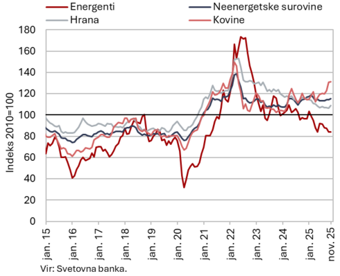 Cena nafte Brent se je novembra v primerjavi z oktobrom v povprečju znižala, povprečna cena neenergetskih surovin pa je ostala skoraj nespremenjena. Povprečna dolarska cena nafte Brent se je nadalje znižala za 1,2 % na 63,80 USD, evrska pa za 0,6 % na 55,19 EUR. K razmeroma nizki ceni je med drugim prispevala odločitev skupine OPEC+ o povečanju proizvodnje. Medletno je bila cena nafte v dolarjih nižja za 14,2 %, v evrih pa za 21,1 %. Povprečna evrska cena zemeljskega plina na evropskem trgu (na nizozemski borzi TTF) se je ob povečanem dotoku utekočinjenega zemeljskega plina iz ZDA in stabilni norveški dobavi novembra še znižala, in sicer za 3,3 % na 30,9 EUR/MWh, ter bila najnižja v zadnjem letu in pol; medletno je bila nižja za 30,9 %. Po podatkih Svetovne banke se je povprečna dolarska cena neenergetskih surovin novembra mesečno in medletno malenkost zvišala. Mesečno so se najbolj zvišale cene hrane (za 2,4 %), ki pa so bile na letni ravni precej nižje (–6,3 %). Medletno ostajajo precej dražja gnojila in kovine (17,4 % in 11,9 %).