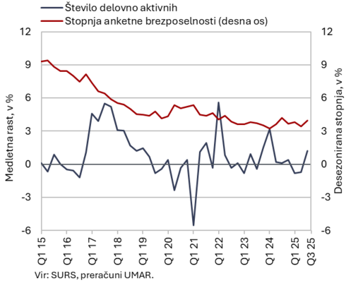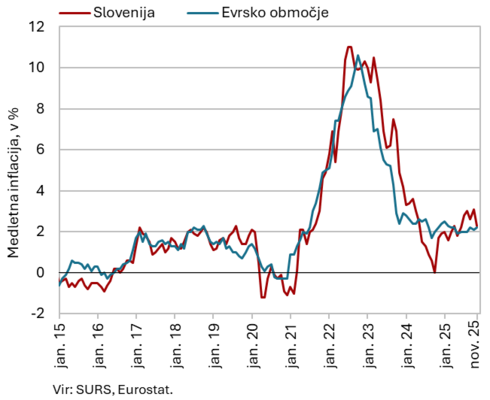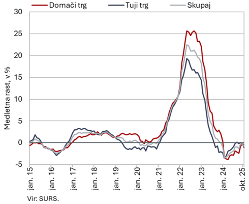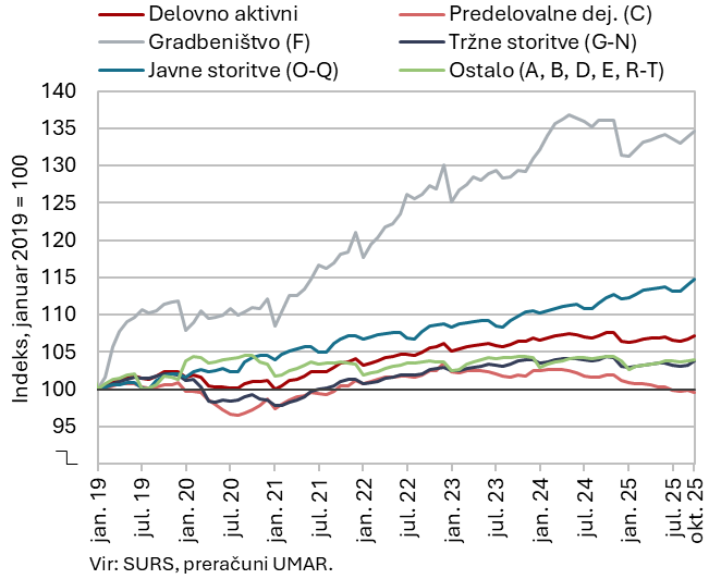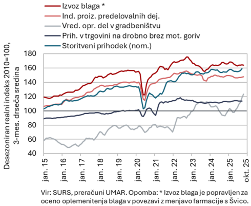 Oktobra se je izvoz blaga nadalje zmanjšal in ostaja medletno nižji. V predelovalnih dejavnostih se je v zadnjih mesecih povečala proizvodnja v visoko in srednje nizko tehnološko zahtevnih panogah, medletno pa skupna proizvodnja ostaja nižja kot pred letom. Obeti v predelovalnih dejavnostih glede pričakovane proizvodnje so se oktobra sicer nadalje izboljšali, a so naročila ostala na nizki ravni. Od drugega četrtletja se močno krepi rast v gradbeništvu. V desetih mesecih so bile večje vrednosti vseh vrst gradbenih del, zlasti v gradnji nestanovanjskih stavb in specializiranih gradbenih delih, rast je bila višja tudi v gradnji inženirskih objektov, v gradnji stanovanjskih stavb pa je ostala skromna. Krepi se tudi prihodek v tržnih storitvah. Kazalnik gospodarske klime v Sloveniji se od sredine leta izboljšuje v v večini dejavnosti, izjema so storitve. Število delovno aktivnih oseb že nekaj mesecev stagnira, število brezposelnih pa se je po rasti v zadnjih mesecih novembra nekoliko zmanjšalo (oboje desez.). Skupna rast bruto plače se je septembra nekoliko okrepila ob višji rasti v javnem sektorju, kar je bila v veliki meri posledica rasti plač v izobraževanju, po naši oceni povezane z izplačili dodatka za učno in pedagoško obveznost. Tudi v zasebnem sektorju je rast ob pomanjkanju delovne sile ostala razmeroma visoka. Medletna rast cen življenjskih potrebščin (2,3 %) je bila novembra najnižja po juniju letos. K inflaciji so še naprej največ prispevale cene hrane in brezalkoholnih pijač, vendar se je njihova rast upočasnila.