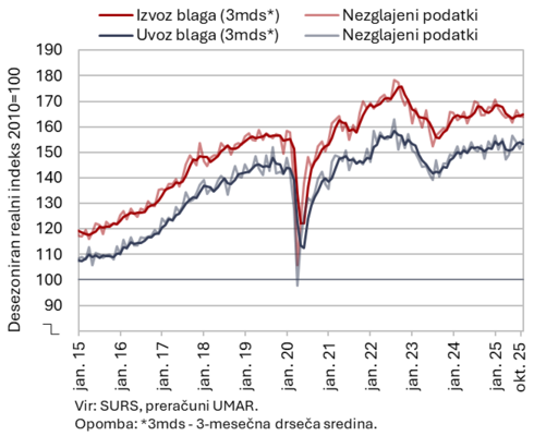 Realni izvoz in uvoz blaga sta se oktobra tekoče zmanjšala; v prvih desetih mesecih je bil izvoz nekoliko manjši, uvoz pa večji kot v enakem obdobju lani. Izvoz blaga se je tekoče zmanjšal tretji mesec zapored (–0,2 % desez.), zlasti v države EU (Nemčija, Italija, Avstrija, Francija), večji pa je bil v države zunaj EU. Opazno se je znova zmanjšal izvoz kovin in kovinskih izdelkov, nekoliko pa tudi strojev in naprav, razen izvoza cestnih vozil. Večji je bil izvoz farmacije in drugih kemijskih proizvodov. Uvoz se je tekoče zmanjšal (1,7 % desez.). Večji je bil uvoz proizvodov za vmesno potrošnjo, ki pa že več mesecev opazneje niha. Manjša kot v predhodnem mesecu sta bila uvoza proizvodov za široko in investicijsko potrošnjo. V prvih desetih mesecih je skupni izvoz blaga medletno ostal podoben kot pred letom (–0,1 %), uvoz pa je bil večji za 0,7 %.