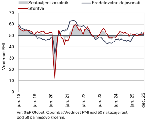 Kazalniki gospodarskega razpoloženja v evrskem območju za zadnje četrtletje nakazujejo nadaljevanje rasti aktivnosti, v Nemčiji poslabšanje gospodarske klime v decembru. Povprečna vrednost sestavljenega kazalnika vodij nabave (PMI) za evrsko območje je bila v zadnjem letošnjem četrtletju najvišja v zadnjih treh letih in pol (52,4). K izboljšanju je prispeval kazalnik za storitvene dejavnosti, ki se je povzpel nad dolgoletno povprečje, kazalnik za predelovalne dejavnosti pa je nakazoval, da se je rast aktivnosti v zadnjem četrtletju upočasnila. Kazalnik gospodarske klime ESI za evrsko območje je bil novembra najvišji po aprilu leta 2023, zaupanje se je v primerjavi z oktobrom izboljšalo v večini dejavnosti (razen industriji), med potrošniki pa je ostalo nespremenjeno. Gospodarska klima je bila boljša tudi v primerjavi z lanskim novembrom, zaupanje je bilo opazno višje v gradbeništvu in industriji. V Nemčiji pa se je kazalnik gospodarske klime Ifo decembra še nekoliko poslabšal, k čemur so prispevala predvsem bolj pesimistična pričakovanja glede poslovanja podjetij v predelovalnih dejavnostih.