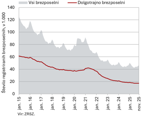 Število registriranih brezposelnih oseb se je po naraščanju v preteklih štirih mesecih novembra tekoče malenkost zmanjšalo (–0,2 %, desez.), medletno pa ostalo malenkost večje (0,2 %). Naraščanje v preteklih mesecih lahko povezujemo z večjim prilivom tujih državljanov s statusom začasne zaščite v evidenco brezposelnih od julija letos, ki v novembru ni več pomembno prispeval k prilivu v brezposelnost. Medletni upad dolgotrajno brezposelnih (–6,9 %) in upad brezposelnih, starejših od 50 let (–7,6 %), sta bila podobna kot prejšnje mesece. Število brezposelnih mladih (15–29 let) od konca lanskega leta presega ravni izpred leta (novembra jih je bilo medletno 9,3 % več).