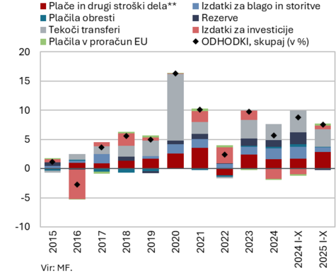 Primanjkljaj konsolidirane bilance javnega financiranja je v desetih mesecih letošnjega leta znašal 1 mrd EUR, kar je 453 mio več kot lani, povečanje pa je bilo načrtovano. V desetih mesecih so se prihodki zvišali za 5,7 %, kar je znatno manj kot v enakem obdobju lani (10,6 %). Letošnja upočasnitev je povezana s konjunkturnimi dejavniki in ukrepi, ki so lani vplivali na visoko rast socialnih prispevkov ter določenih davčnih prihodkov. Odhodki so bili v desetih mesecih letos medletno višji za 7,5 %, kar je nekoliko nižja rast kot v enakem obdobju lani (8,8 %). K rasti odhodkov letos največ prispevajo sredstva za plače zaposlenim zaradi izvajanja plačne reforme, pokojnine in nekateri drugi transferji . Po znižanju v lanskem letu se letos povečujejo tudi investicijski odhodki, zlasti za nakup vojaške opreme . Pretežni del primanjkljaja konsolidirane bilance izhaja iz primanjkljaja državnega proračuna. Ta je v desetih mesecih letos znašal 910 mio EUR, po prvih podatkih za enajst mesecev pa se je še nekoliko povečal (976 mio EUR). Do konca leta pričakujemo, da se bo primanjkljaj še povečal, kar je bilo načrtovano, in sicer zlasti zaradi povečanja odhodkov zaradi druge tranše izplačil v okviru plačne reforme v javnem sektorju, izplačila zimskega regresa javnim uslužbencem, izplačila zimskega dodatka za upokojence in krepitve investicijske porabe.