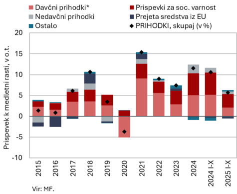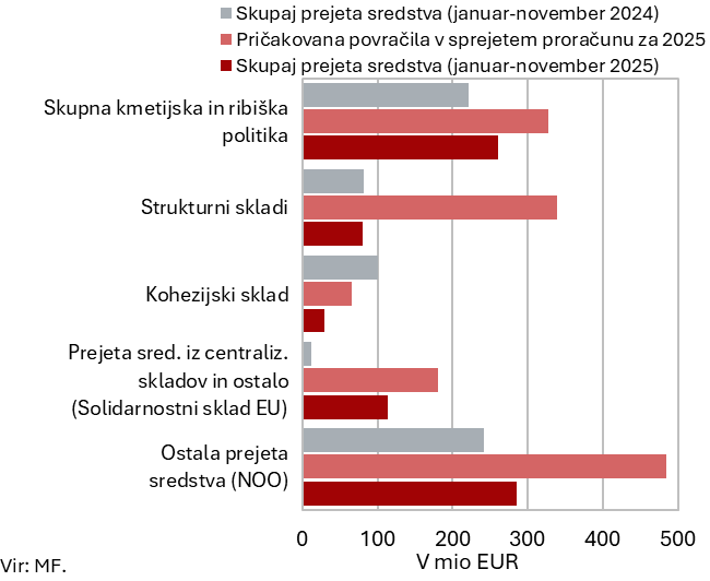 Neto položaj državnega proračuna do proračuna EU je bil v enajstih mesecih leta 2025 pozitiven (107,9 mio EUR). Slovenija je v tem obdobju iz proračuna EU prejela 766,9 mio EUR (54,9 % v sprejetem proračunu načrtovanih prihodkov za leto 2025), plačala pa 659,1 mio EUR (90,1 % načrtovanih letnih plačil). Med vsemi prihodki iz proračuna EU je državni proračun do novembra 2025 prejel največ prihodkov zaradi izvajanja Načrta za okrevanje in odpornost (33,9 % vseh povračil v državni proračun in 58,9 % pričakovanih v sprejetem proračunu) ter za izvajanje skupne kmetijske in ribiške politike (33,9 % vseh povračil v državni proračun ter 79,3 % pričakovanih povračil v letu 2025). Iz centraliziranih in drugih programov, kjer prevladujejo sredstva Solidarnostnega sklada, je bilo v državni proračun povrnjeno 14,8 % vseh povračil (62,8 % načrtovanih v sprejetem proračunu), iz strukturnih skladov pa 10,4 % vseh povračil (23,5 % pričakovanih povračil v letu 2025). Slovenija je novembra 2025 prejela 440 mio EUR na osnovi četrtega zahtevka za plačilo iz Mehanizma za okrevanje in odpornost, decembra pa je Evropska komisija potrdila tudi četrto spremembo NOO, ki prinaša prilagoditev posameznih mejnikov in ciljev, zmanjšanje njihovega števila ter poenostavitev aktivnosti za njihovo izpolnitev. Glede na Informacijo o izvajanju NOO (december 2025) je letos predvidena oddaja še petega zahtevka za izplačilo Evropski komisiji, še dveh pa v letu 2026.