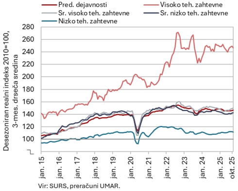 Izvoz blaga še naprej upada, v predelovalnih dejavnostih pa se zadnje mesece krepi predvsem aktivnost v visoko in srednje nizko tehnološko zahtevnih panogah. Predvsem v gradbeništvu in tudi večini tržnih storitev se rast krepi. Tekoča negativna gibanja v predelovalnih dejavnostih so se zadnje mesece ustavila, proizvodnja se še naprej povečuje v visoko in srednje nizko tehnološko zahtevnih panogah (desez.). V medletni primerjavi proizvodnja ostaja nižja kot leto prej, v desetih mesecih leta za 1,1 %. Obeti v predelovalnih dejavnostih glede pričakovane proizvodnje so se oktobra sicer nadalje izboljšali, naročila pa so ostala na nizki ravni. Realni izvoz blaga se je oktobra tekoče zmanjšal tretji mesec zapored in se znižal na raven iz aprila. Izvoz se znižuje zlasti v države EU. Med izdelki se zmanjšuje izvoz kovin in kovinskih izdelkov, povečuje pa izvoz farmacije in drugih kemijskih proizvodov. V prvih desetih mesecih je skupni izvoz blaga medletno ostal podoben kot pred letom (–0,1 %). Uvoz je bil večji za 0,7 %. Izvoz in uvoz storitev sta bila v prvih desetih mesecih večja kot v enakem obdobju lani (3,2 % oz. 4,5 %), kar je bilo povezano z večjo menjavo večine glavnih skupin storitev. Presežek tekočega računa plačilne bilance je bil v desetih mesecih medletno nižji za dobrih 400 mio EUR in je znašal 2,4 mrd EUR. Po upadu v prvem četrtletju se je od drugega četrtletja izredno okrepila rast vrednosti opravljenih gradbenih del, ki je bila v desetih mesecih medletno večja za desetino. Večje so bile vrednosti vseh vrst gradbenih del, zlasti v gradnji nestanovanjskih stavb (16 %) in specializiranih gradbenih delih (15 %), rast je bila višja tudi v gradnji inženirskih objektov (7 %), v gradnji stanovanjskih stavb pa je ostala skromna (1 %). Krepi se tudi prihodek v tržnih storitvah. V tretjem četrtletju se je tekoče precej povečal (2,8 %), znatno se je okrepil v informacijsko-komunikacijskih dejavnostih. Rast je izhajala predvsem iz večje prodaje računalniških storitev na domačem trgu. Razmeroma visoka rast prihodka je bila tudi v strokovno-tehničnih dejavnostih. Skupna rast storitvenega prihodka je bila v devetih mesecih leta medletno skromna (0,6 %). V enakem obdobju je bila skromna tudi medletna realna rast prihodka v večini trgovinskih panog, razen v trgovini z motornimi vozili, kjer se je prihodek v tretjem četrtletju tekoče ponovno povečal. Vrednost kazalnika gospodarske klime se je novembra nadalje izboljšala in je po treh letih presegla dolgoročno povprečje.