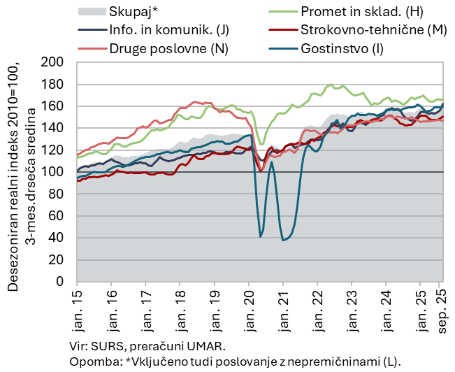 Skupni realni prihodek tržnih storitev se je v tretjem četrtletju v primerjavi z drugim močno povečal (za 2,8 %, desez.), okrepil se je tudi medletno (za 2,5 %). Po rasti v prvi polovici leta se je prihodek tekoče znatno okrepil v informacijsko-komunikacijskih dejavnostih. Rast je izhajala predvsem iz večje prodaje računalniških storitev na domačem trgu. Razmeroma visoka rast prihodka je bila tudi v strokovno-tehničnih dejavnostih, kjer se je prihodek v prvi polovici leta zmanjšal. Prihodek se je po dveh četrtletjih zmanjševanja nekoliko povečal tudi v dejavnosti prometa in skladiščenja, in sicer v obeh glavnih dejavnostih, kopenskem prometu in skladiščenju. Gostinski prihodek se je nekoliko povečal drugo četrtletje zapored. V drugih poslovnih dejavnostih se je nadaljevala stagnacija prihodka iz prve polovice leta, predvsem zaradi nadaljnjega krčenja prihodka v zaposlovalnih storitvah. V prvih devetih mesecih leta je bil realni prihodek medletno manjši le v drugih poslovnih dejavnostih.