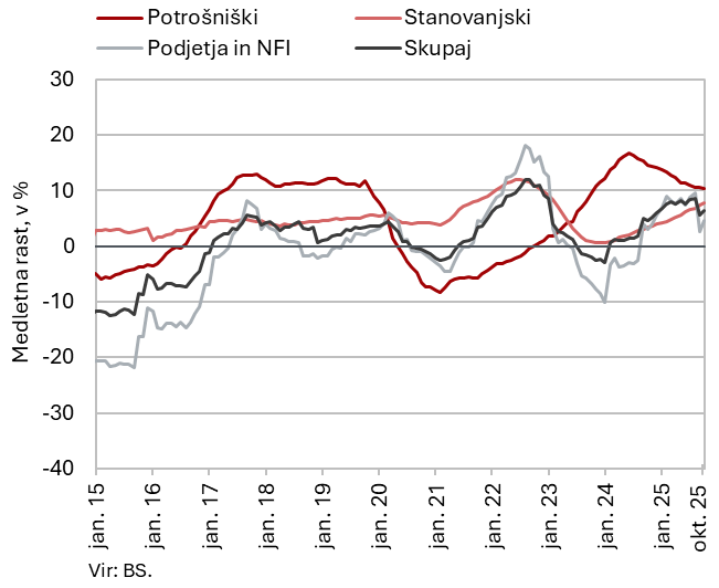 Medletna rast obsega kreditov domačim nebančnim sektorjem se je oktobra povišala na 6,4 %. Po tem ko je septembra na medletno rast vplivala predvsem višja osnova, je tokrat rast zaznamovala razmeroma močna kreditna aktivnost. Obseg kreditov se je tako na mesečni ravni povišal za 1,1 %, kar je, z izjemo lanskega septembra, najvišja rast v zadnjih treh letih. K medletni rasti največ prispeva rast kreditov gospodinjstvom, kjer se še naprej postopoma krepijo stanovanjska posojila. Ta so bila medletno višja za 7,8 %, rast potrošniških posojil pa se postopoma znižuje, a je s 10,4 % še vedno razmeroma visoka. Medletna rast vlog nebančnih sektorjev je bila s 6,1 % blizu rasti obsega kreditov nebančnim sektorjem, razmerje med krediti in vlogami pa se je ohranilo nekoliko nad 0,70. Delež nedonosnih terjatev se je septembra nekoliko povišal (na 1,2 %), a ostaja nizek. Povišanje je bilo v veliki meri posledica slabšanja kakovosti terjatev v predelovalnih dejavnostih, kjer se je delež nedonosnih terjatev v devetih mesecih letos povečal za skoraj dve tretjini, na 3,9 %.