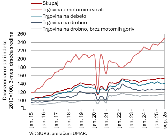 Prihodek v večini trgovinskih panog se je v tretjem četrtletju glede na drugo zmanjšal (desez.). V trgovini na debelo je upadel drugo četrtletje zapored in bil prvič po začetku leta 2024 manjši tudi medletno. Medletno manjši je bil tudi prihodek v trgovini na drobno z živili, ki se je po šibki rasti v drugem četrtletju v tretjem zmanjšal. Prihodek v trgovini na drobno z neživili je ostal podoben kot v drugem četrtletju (ko se je povečal) in bil medletno večji. V trgovini z motornimi vozili pa se je nadaljevala razmeroma visoka rast prihodka. Prodaja v vseh trgovinskih panogah je bila v devetih mesecih medletno večja. V trgovini z motornimi vozili je bila rast visoka (7 %), v ostalih trgovinskih panogah pa skromna (v povprečju 1 %).